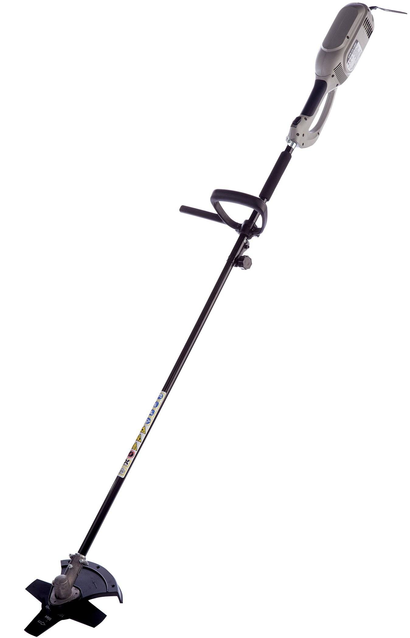 У электрического кустореза КРЭ-23/1000 к угловому редуктору крепится защитный кожух (одинарный – для ножа, составной – для лески), предохраняющий оператора и окружающее пространство от скошенной травы, камней и твердых предметов, отбрасываемых режущим инструментом.