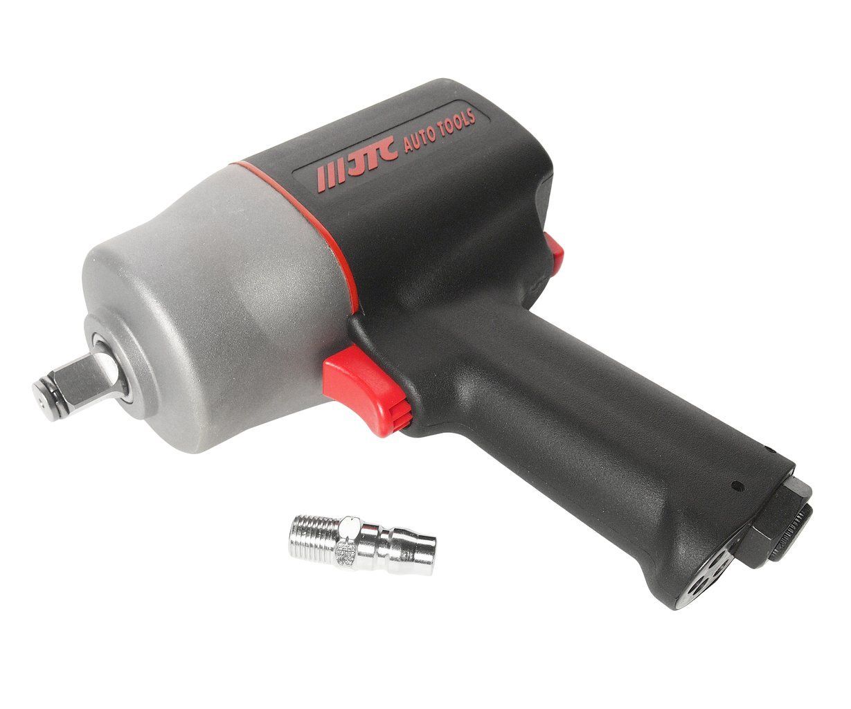 Ударный усиленный пневмогайковерт JTC 5335 выполнен в легком и прочном пластиковом корпусе. Инструмент длиной 17 см не вызывает неудобств при работе в ограниченном пространстве. Выступ рукояти препятствует выскальзыванию пневмогайковерта из рук в ходе эксплуатации. Высокий крутящий момент дает возможность плотно затягивать болты большого размера.