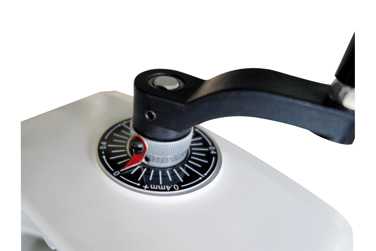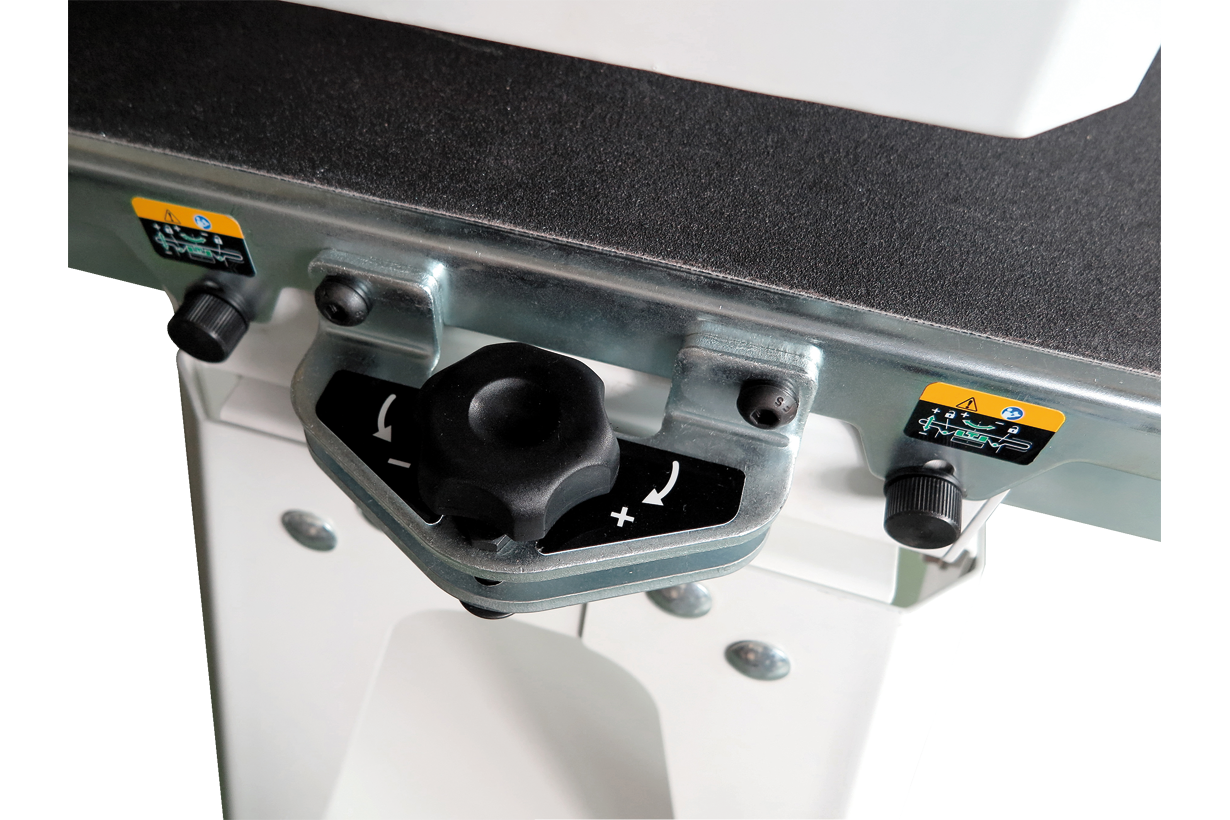 Высота над лентой транспортера регулируется вращением рукоятки, при этом можно контролировать как абсолютное значение по миллиметровой шкале на корпусе, так и относительное перемещение по лимбу на рукоятке. Регулировка параллельности вала и основания производится без использования вспомогательного инструмента: два фиксатора и винтовой упор оборудованы барашковыми рукоятками.