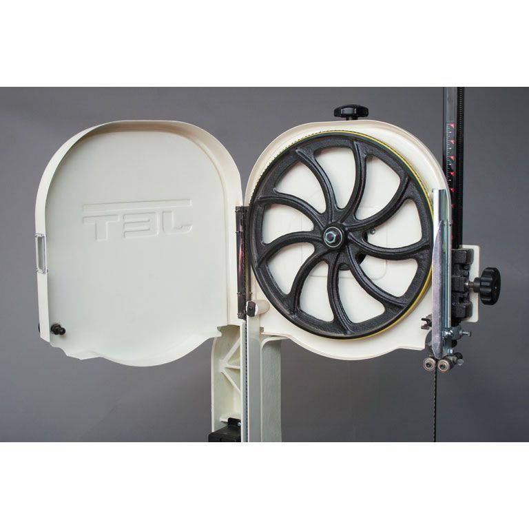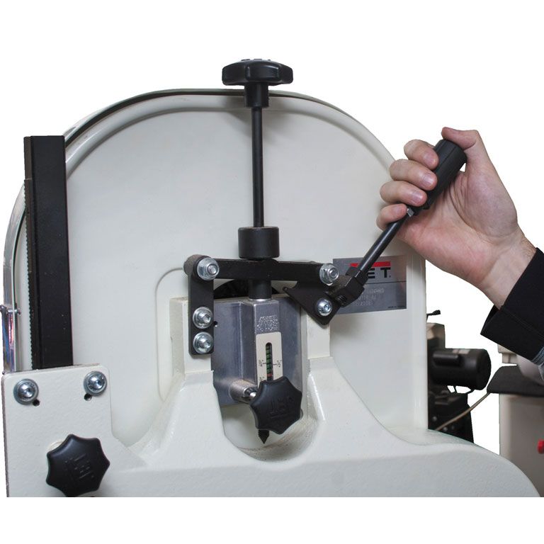 С тыльной стороны сверху станка расположен узел регулировки натяжения ленты, оснащенный индикатором (его показания сравнивают с шириной установленной ленты) и рычагом для быстрого натяжения / ослабления. Высоту установки верхних 3-точечных роликовых направляющих меняют двумя рукоятками: вращая одну, производят фиксацию, вторую - перемещают узел. Ременная передача двухскоростная, что позволяет уверенно работать с широким спектром материалов.