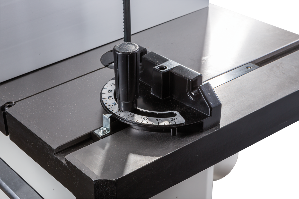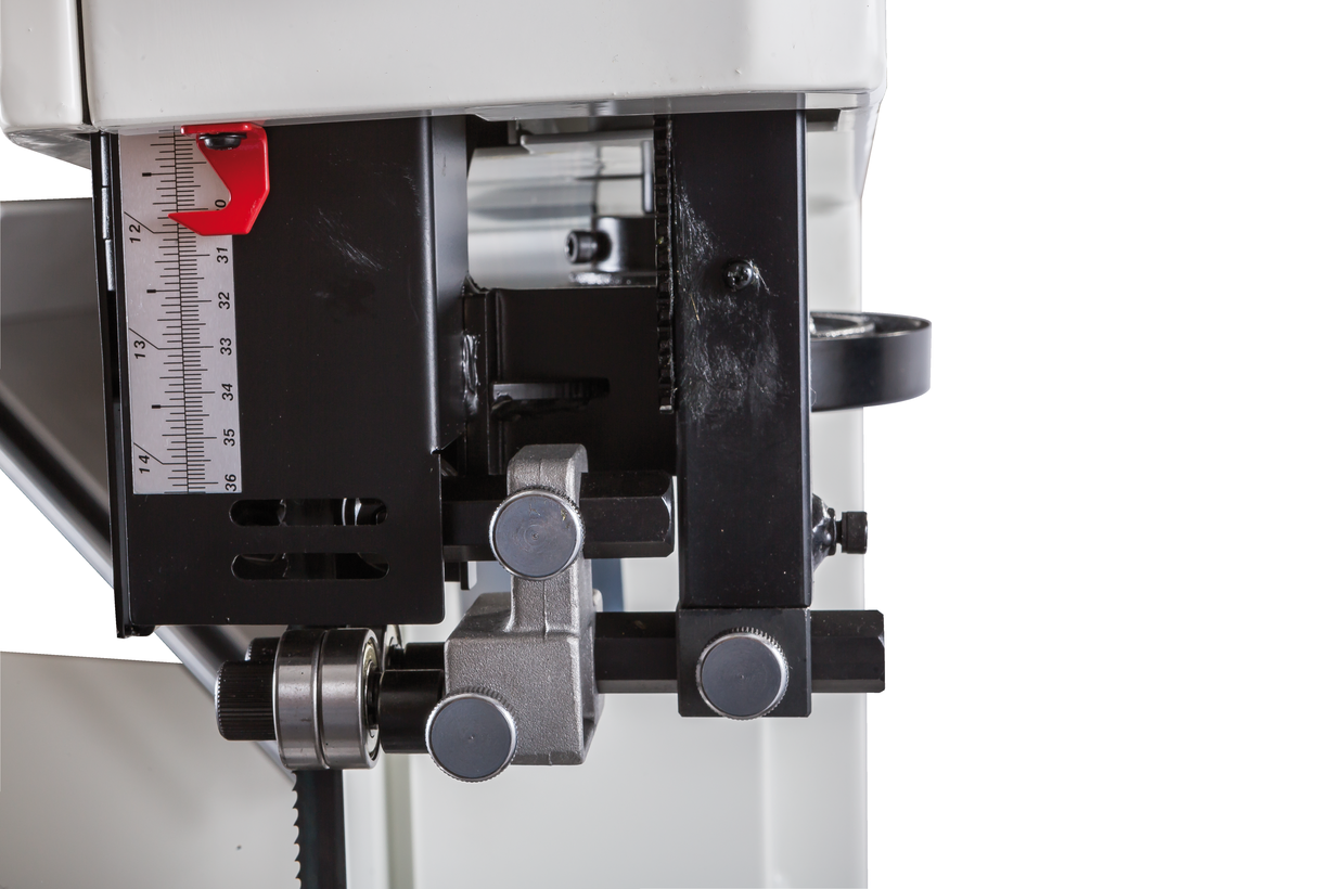 Jet JWBS-15 - ленточная пила нового поколения, предназначенная для профессионального использования. Ее основное преимущество, на фоне аналогов прошлых поколений, - увеличенная высота распиловки. Этот параметр очень важен для тех, кому нужен универсальный станок, способный взять на себя функции делительного. К подобным работам приспособлен и параллельный упор: направляющий профиль можно установить вертикально на боковую грань так, чтобы надежно фиксировать плоские заготовки при их роспуске на тонкие пластины. В целом конструкция бокового упора очень хорошо проработана и соответствует самым строгим требованиям: профиль жесткий и прочный, закреплен на массивном чугунном кронштейне, который перемещается по цилиндрической направляющей. Предусмотрена грубая (вручную) и точная (микрометрическим винтом) установка.