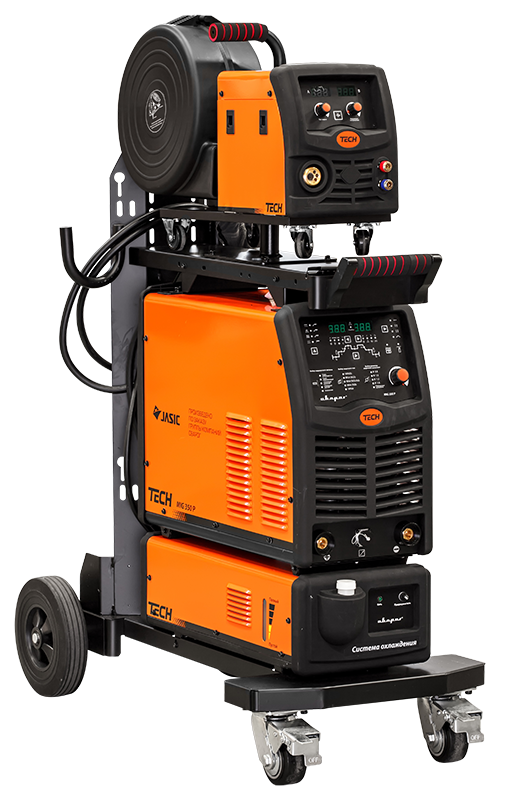 - Блочная система на прочной тележке: источник сварочного тока, подающее устройство и теплообменник .