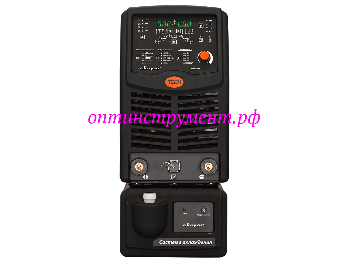 TECH MIG 350 P (N316) состоит из выносного подающего механизма, источника питания и блока жидкостного охлаждения. Все оборудование располагается на удобной тележке с площадкой для крепления баллона. Панель подающего механизма оснащена индикаторами тока и напряжения. На блоке кулера расположен индикатор уровня жидкости, а подключение блока производится без дополнительных проводов.