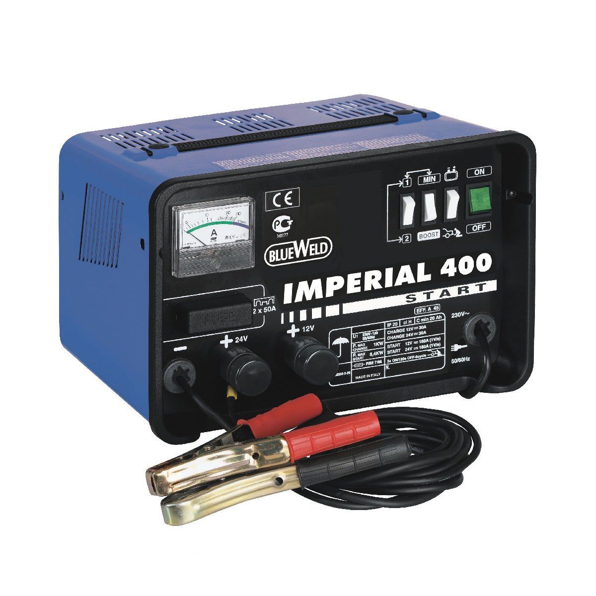 Пускозарядное устройство BlueWeld Imperial 400 Start предназначено для зарядки свинцовых аккумуляторов всех видов на 12 и 24В, а так же для запуска машин с бензиновыми и дизельными двигателями. Устройство заряжает аккумулятор и запускает двигатель только когда подключено к сети.