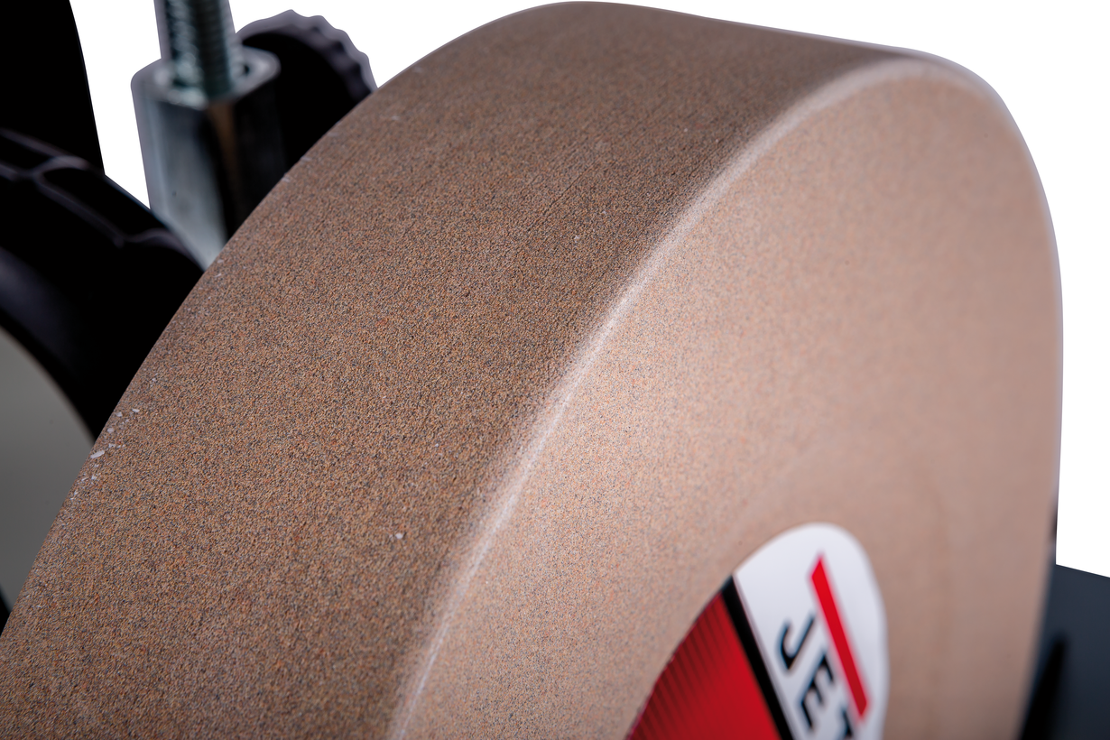 Jet JSSG-10 - шлифовально-полировальный станок для заточки, правки и доводки режущего инструмента (в основном ручного) с высокой точностью и без отпуска режущей кромки. Вал с кругами (абразивным, шлифовальным и кожаным полировальным) вращается с небольшой скоростью, которую можно регулировать при помощи рукоятки на передней панели станка. Шлифовальный камень погружен в ванну для смачивания водой.