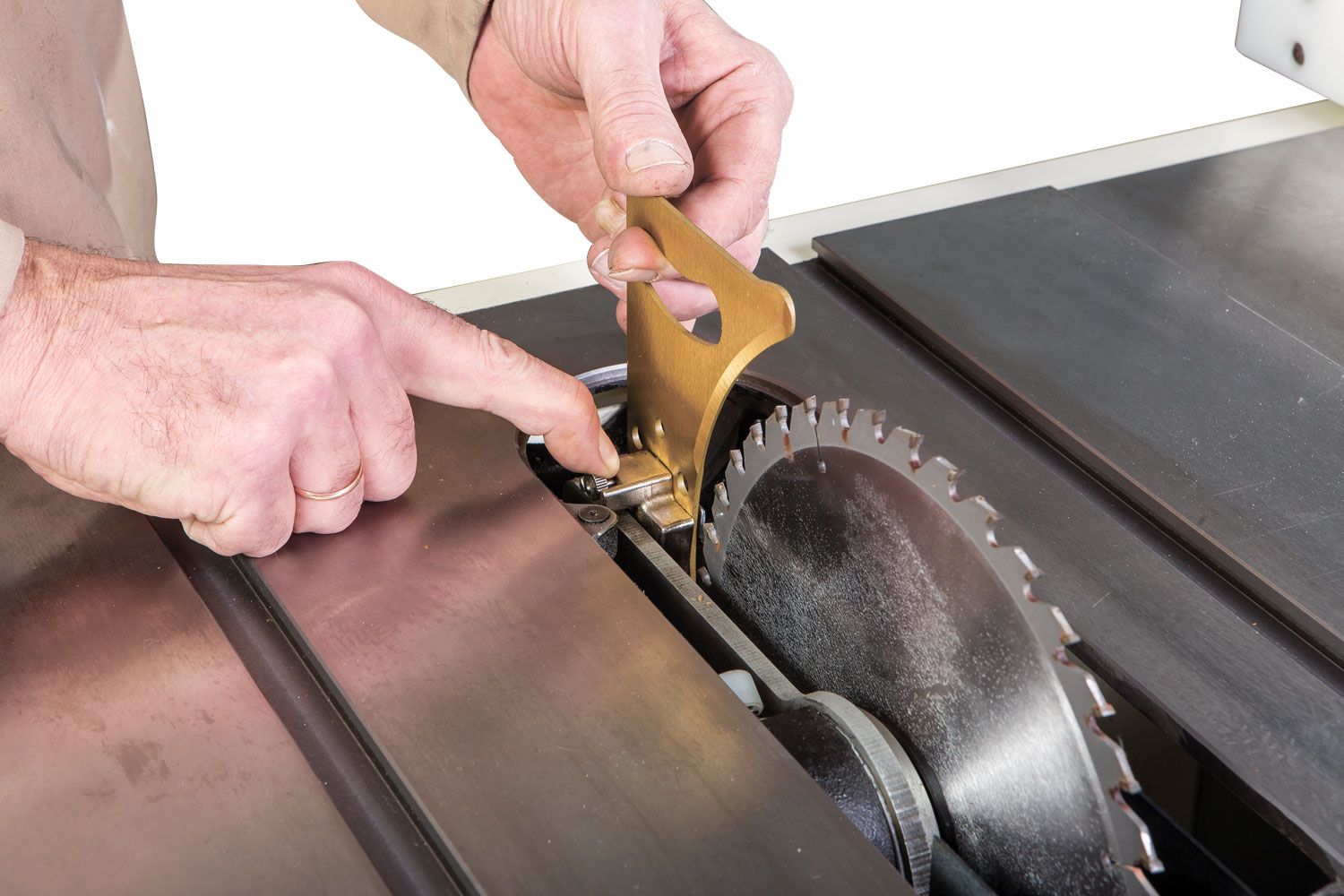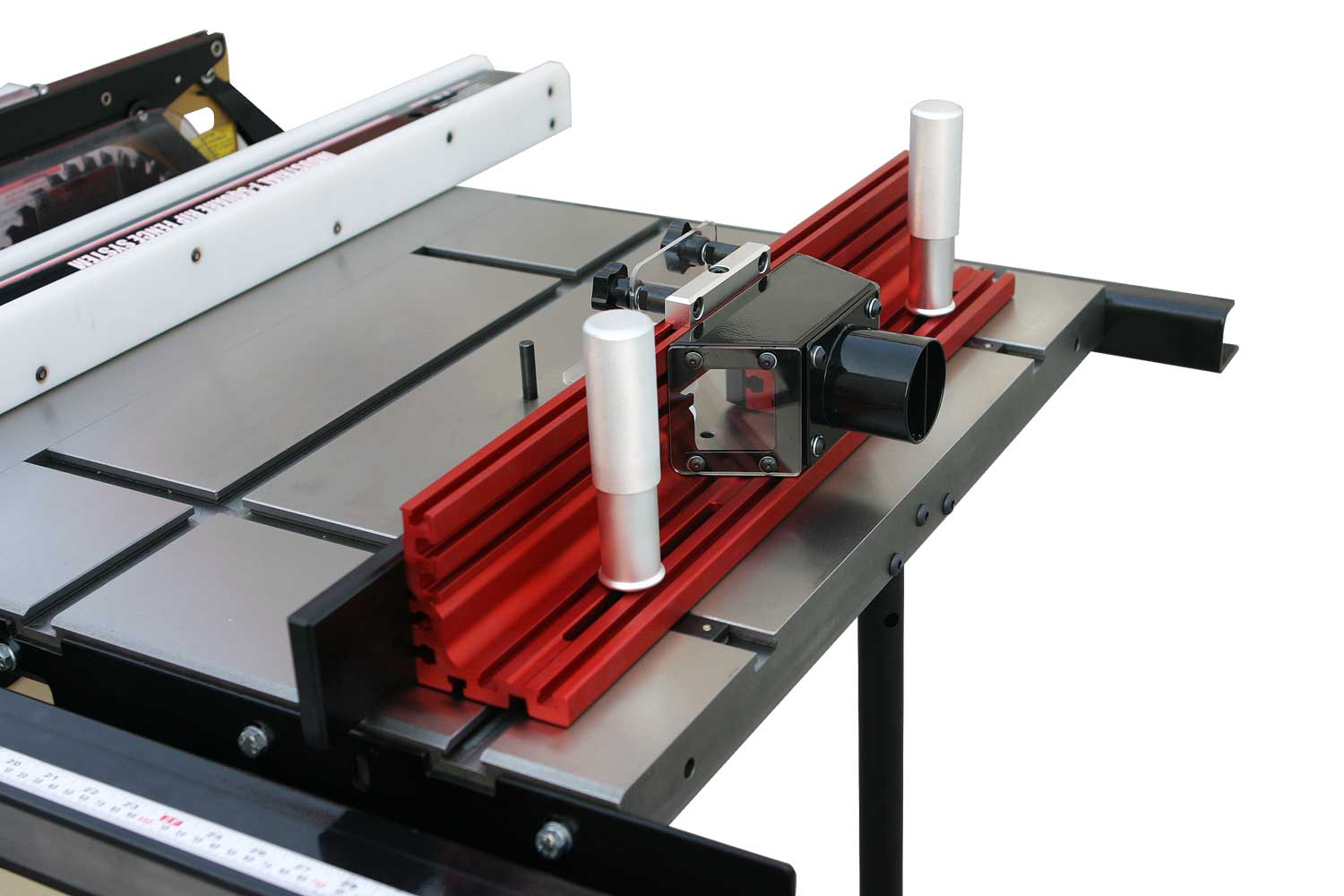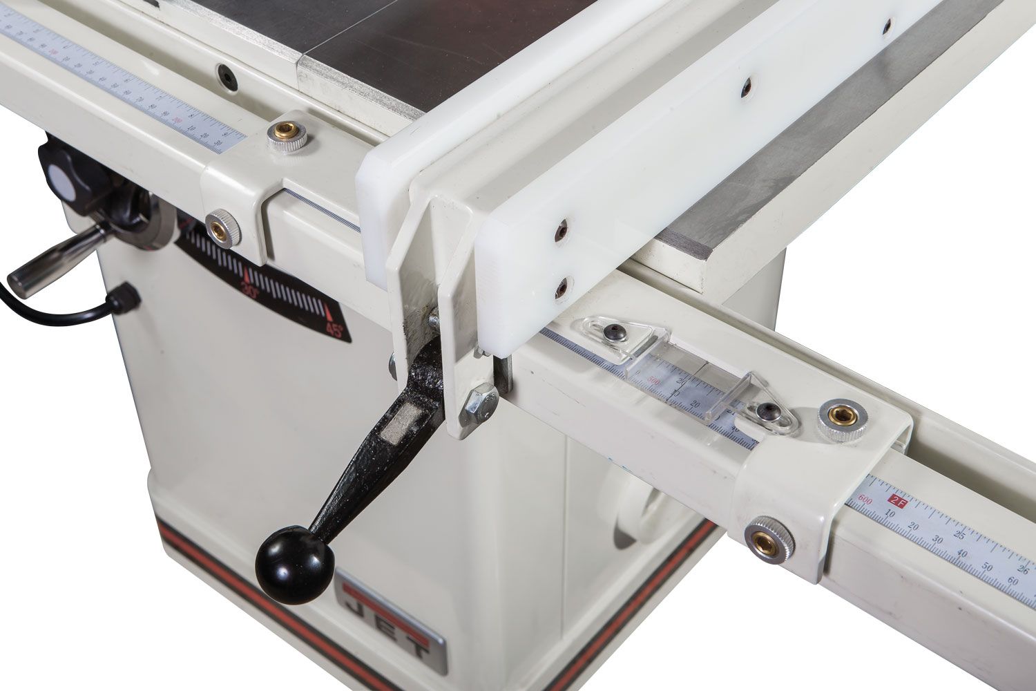 Штатная комплектация включает в себя два чугунных расширителя и параллельный упор с фторопластовыми накладками и эксцентриковой фиксацией на 50-дюймовых направляющих. Все ответственные детали выполнены из массивных чугунных отливок, регулировки высоты и наклона диска производят крупными маховиками, предусмотрена возможность точной юстировки его крайних положений. Такое оснащение, характерное для более дорогих моделей, само по себе делает JTS-250CSX выгодным приобретением. Но есть и другие преимущества: к примеру, конструкция пильного модуля позволяет устанавливать дисковую пазовую фрезу Dado (поставляется за отдельную плату). Для расширения возможностей при работе с этим комплектом доступно в качестве опции шипорезное приспособление. Это зажим для заготовок с возможностью перемещения вдоль Т-образного паза.